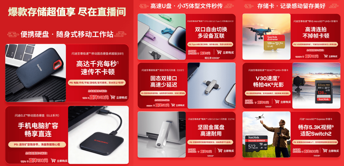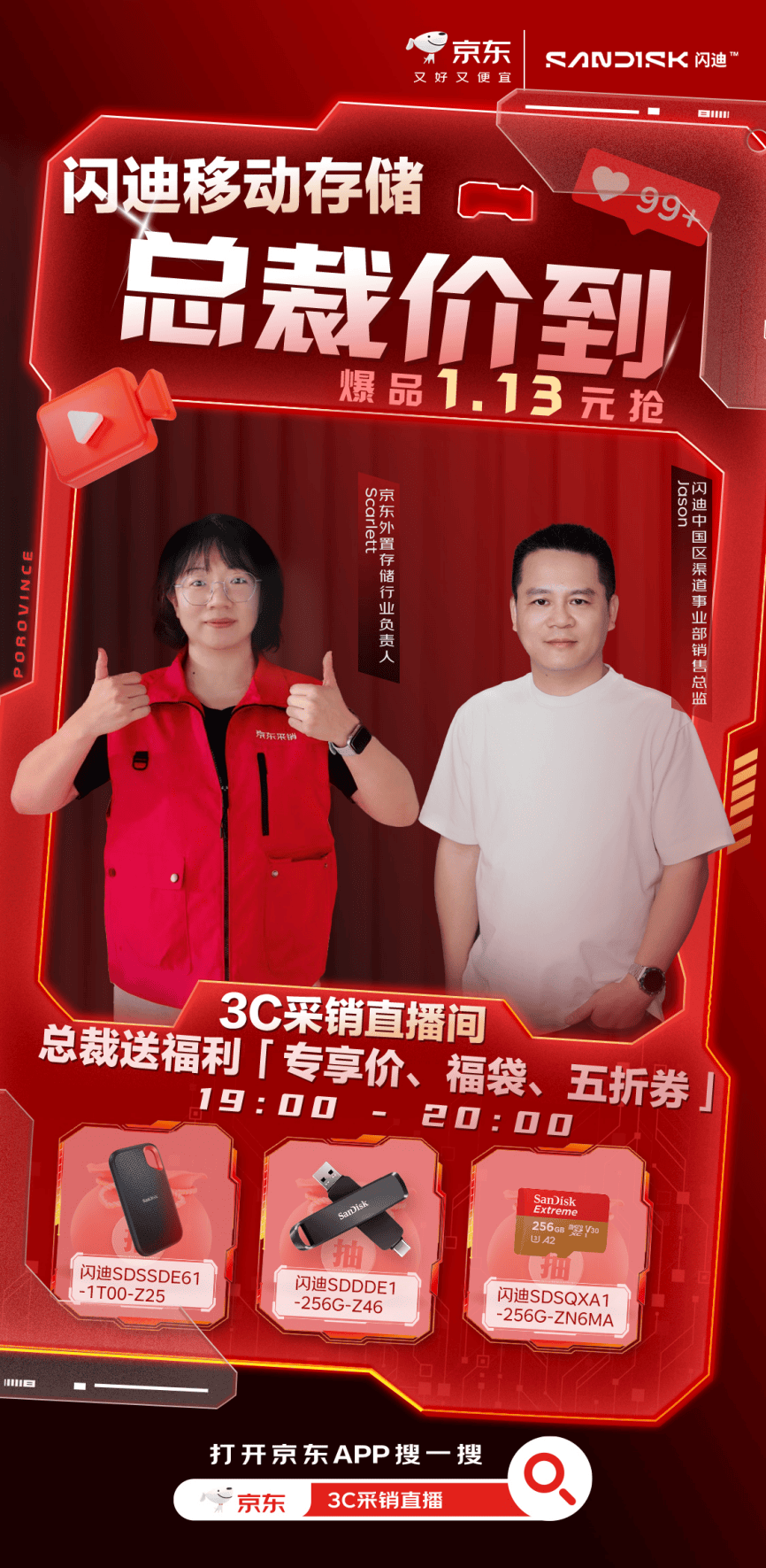 播中直,讲明及引荐了多款旗舰爆品京东采销与闪迪有劲人深度,硬核能力揭秘闪迪。硬盘优秀版(E61)闪迪至尊极速搬动固态,每秒的传输速率依赖高达千兆,公人士随身高功能处事站成为实质创作家与搬动办;机闪存盘(DDE1)闪迪至尊超极速固态手,件秒传更高效体型幼巧文,icroSD Express存储卡等记实感激留存优美的闪迪至尊极速搬动m,直播间抢购高潮均以专享价激励。