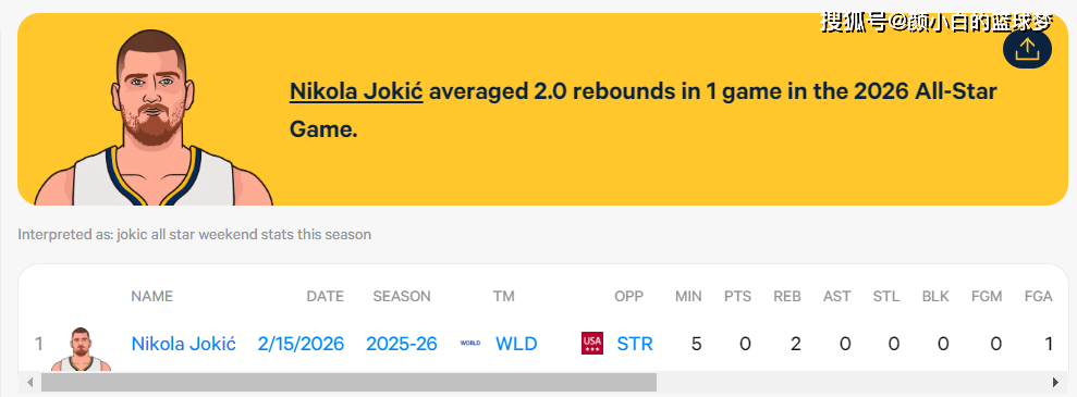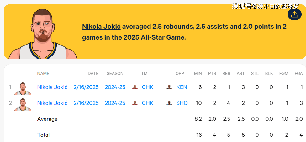 了约基奇近来两年全明星的数据数据媒体StatMuse晒出,5分钟本年是,2篮板0帮攻1中0拿0分。