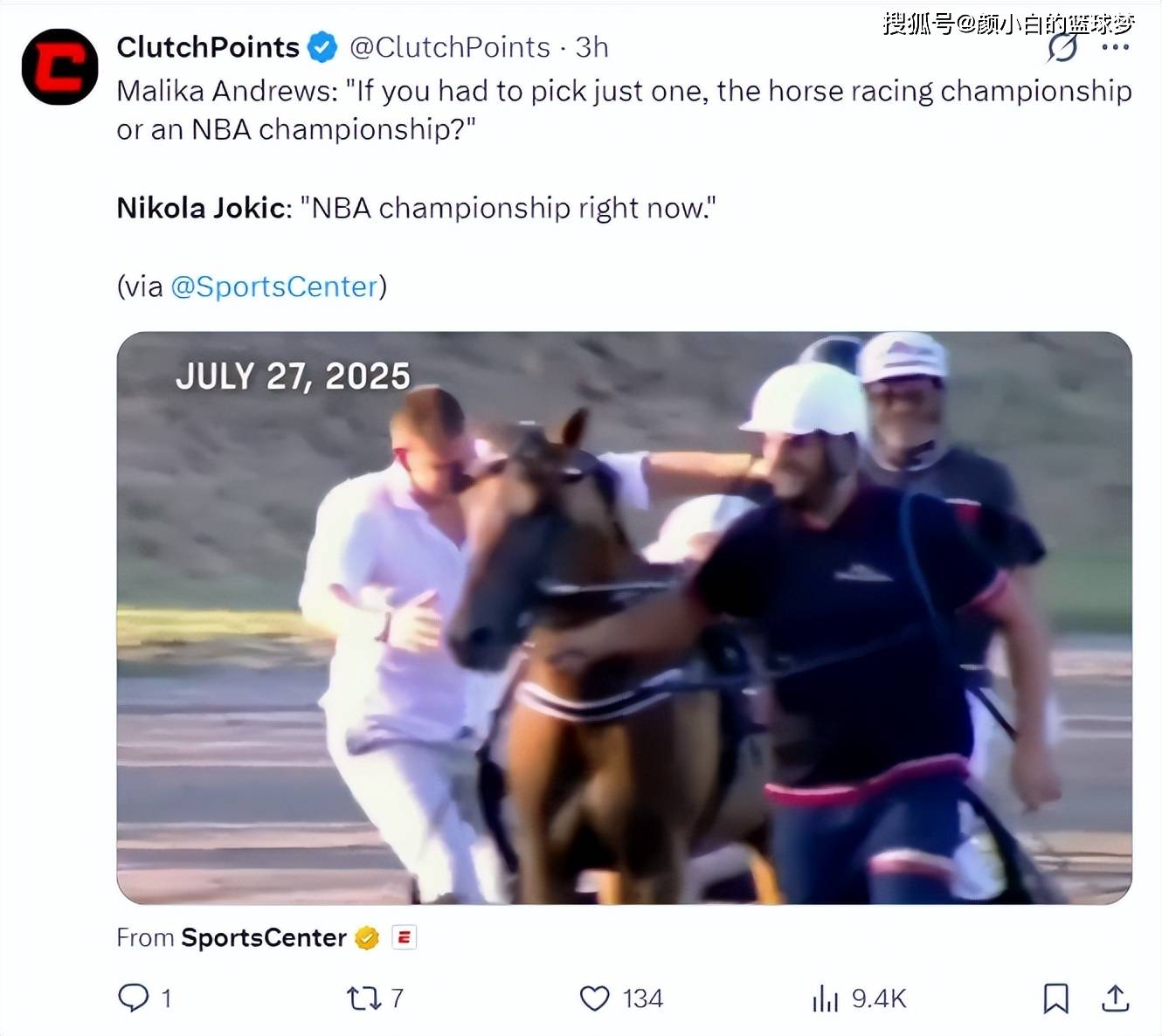 问约基奇记者还询,?约基奇暗示:倘若是现正在的话选NBA总冠军倘若是你的跑马冠军与NBA冠军你抉择哪一个。己的马夺冠后陨泣(此前约基奇正在自,后自身不光不会哭他讲到詹姆斯退伍,都不会有连伤感)